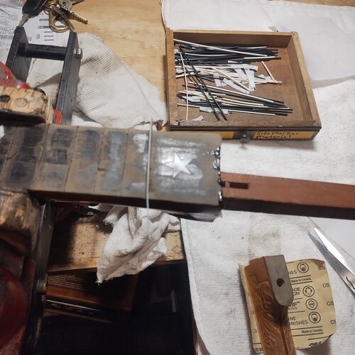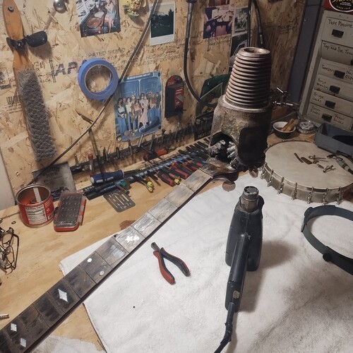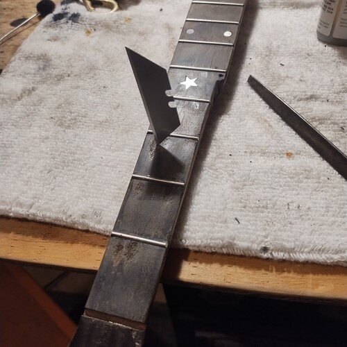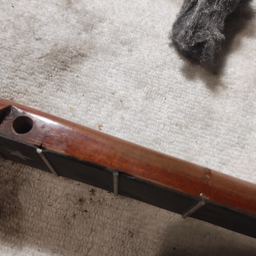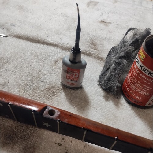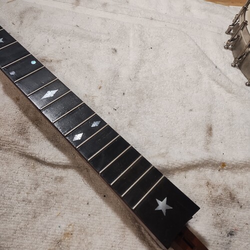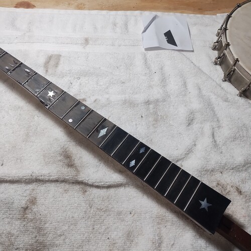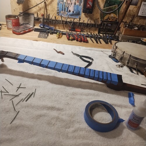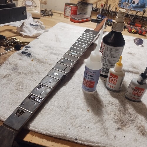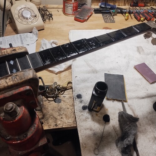 Moving along slowly, sealing frets as I go.