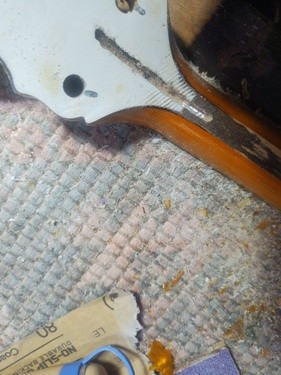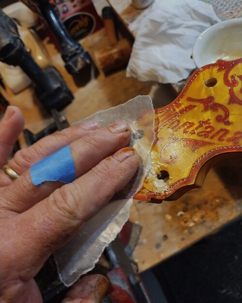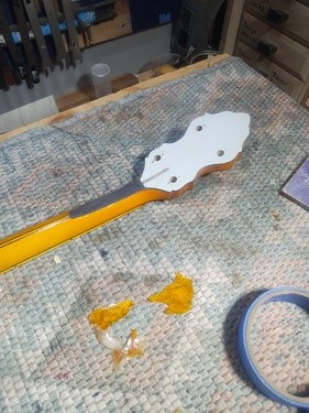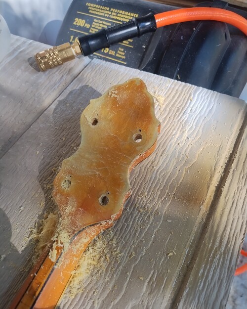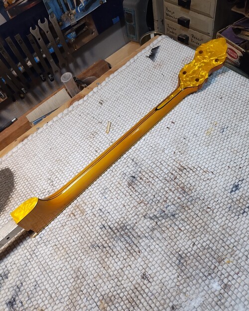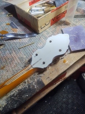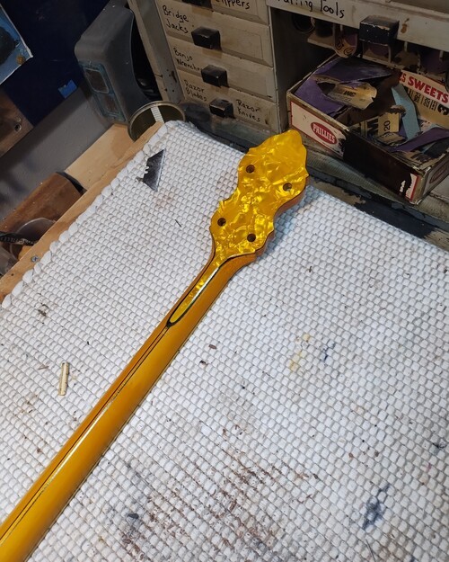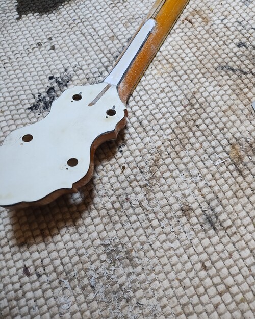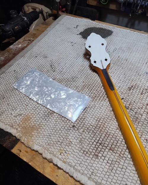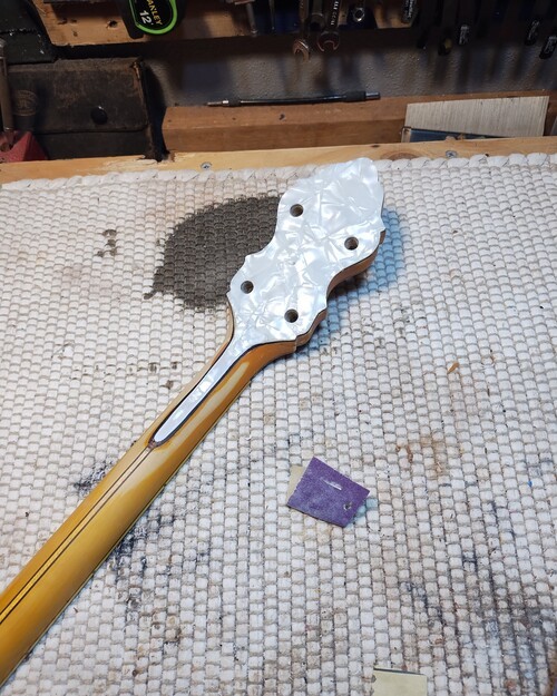 It showed a flaw today as the new nitro finish reacted with its top (perloid) layer and lifted what was already sketchy. I noticed it by a peg hole, it had a chip this morning that came out when I tightened them one last time (Ha). So I stuck a micro chisel in, saw it lift up even more and just popped it off, because I knew it was going to be "other than easy"