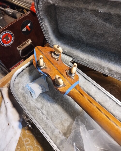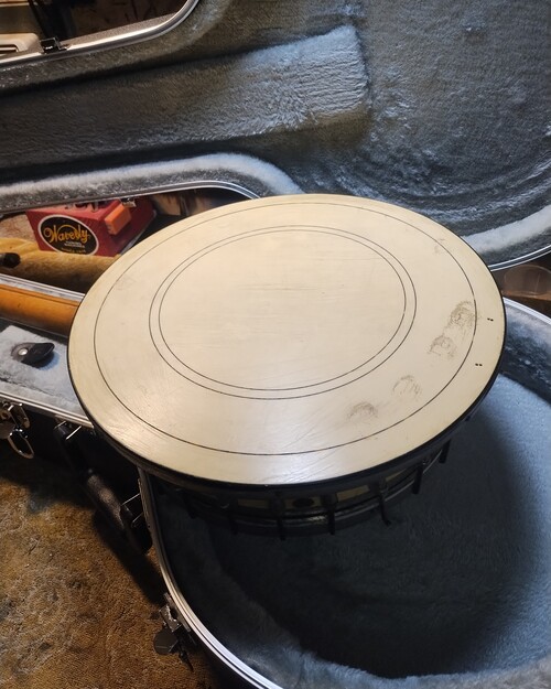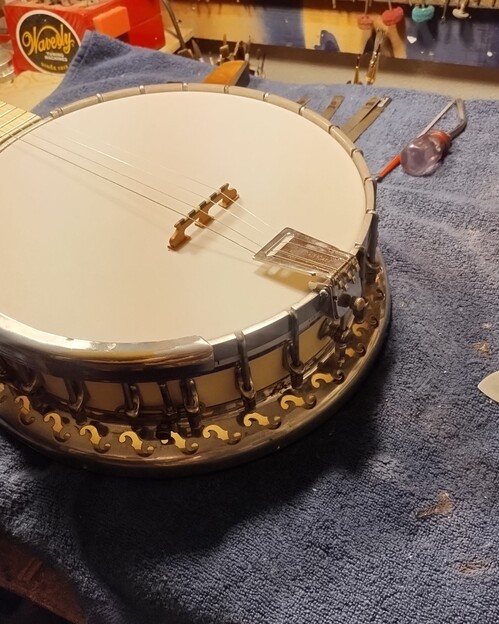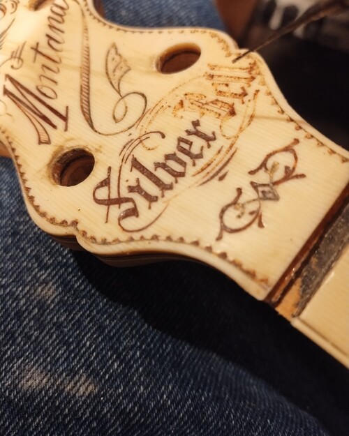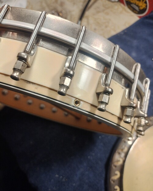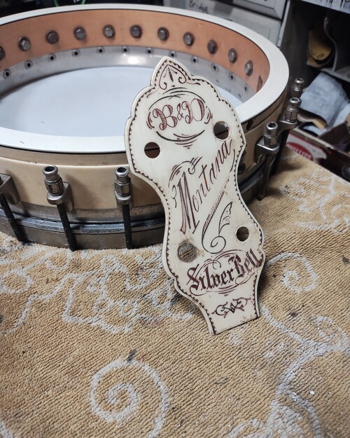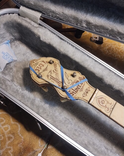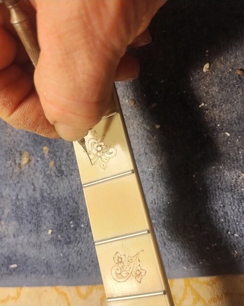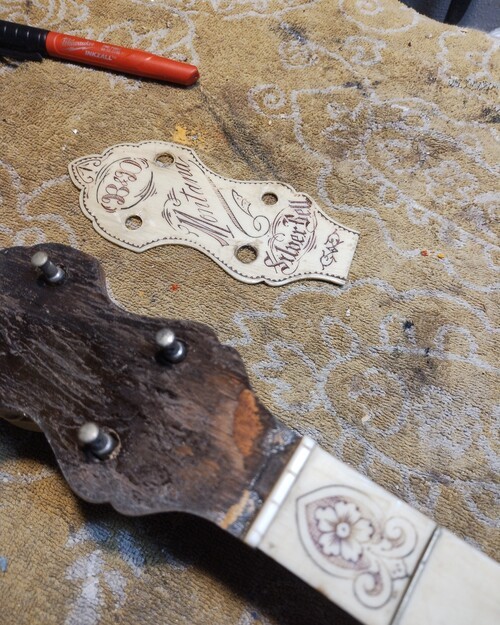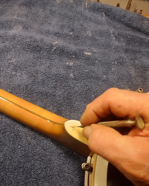 This is one of many banjos that I have worked on, with celluloid fingerboard and overlays that are shrinking from loss of moisture over the years, lifting, cupped, cracked, all the way to disintegrating.