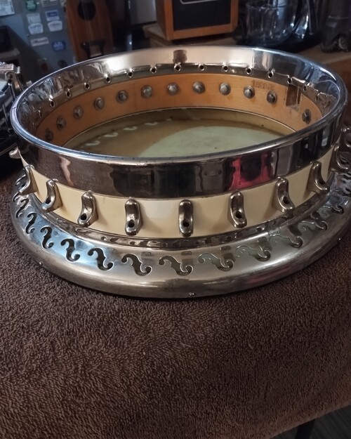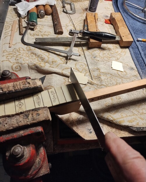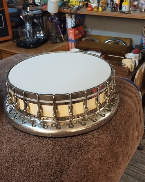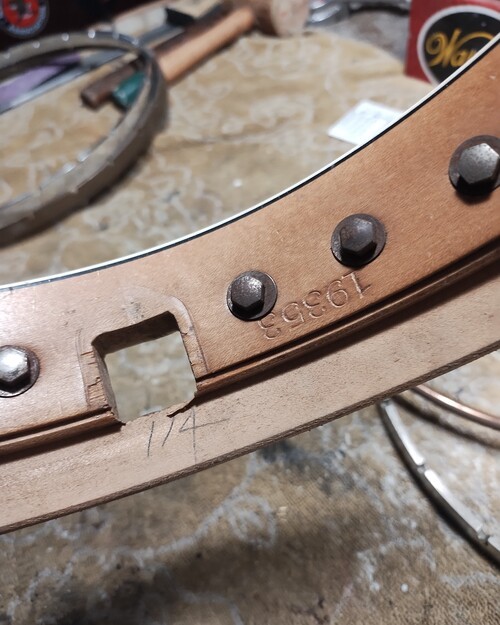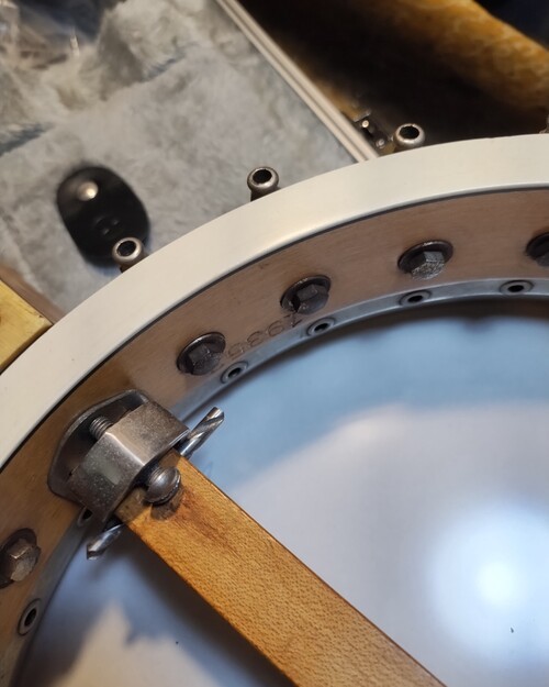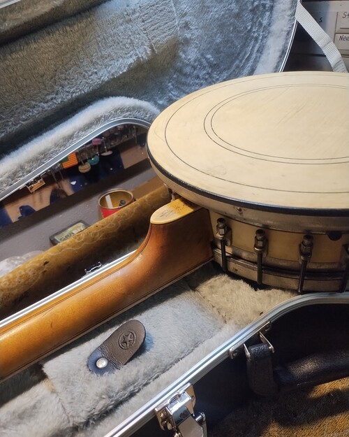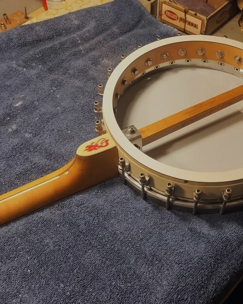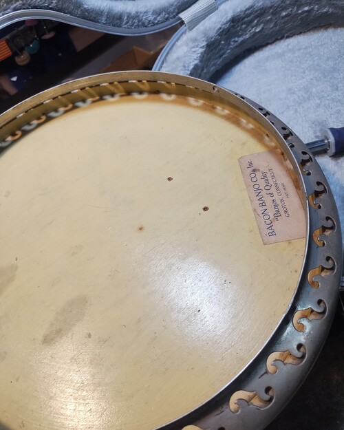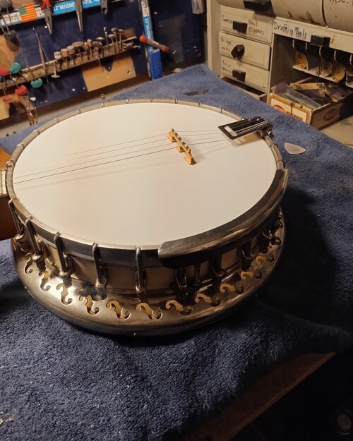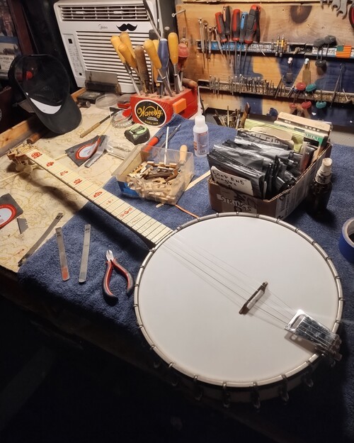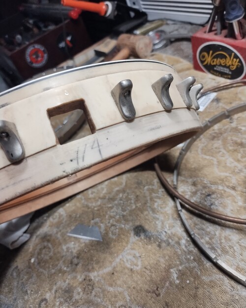 This is one of many banjos that I have worked on, with celluloid fingerboard and overlays that are shrinking from loss of moisture over the years, lifting, cupped, cracked, all the way to disintegrating.