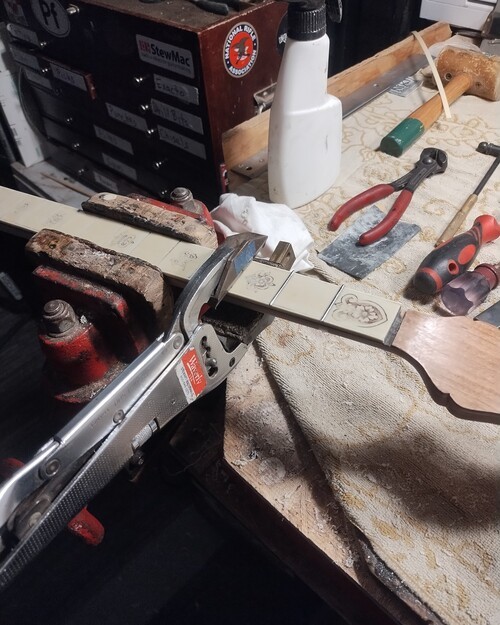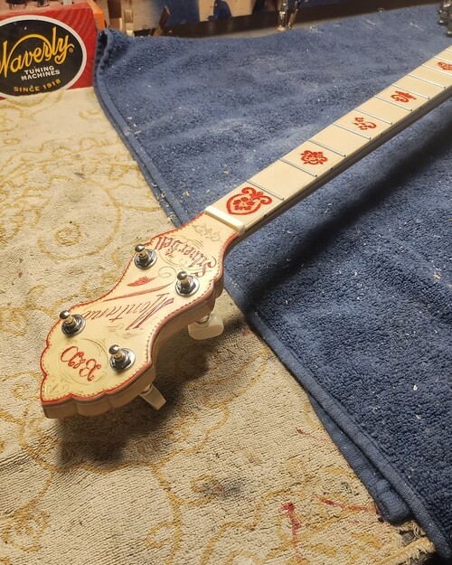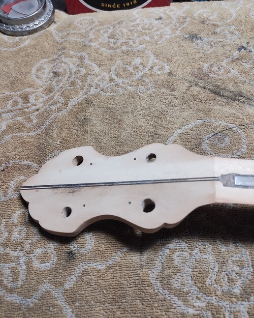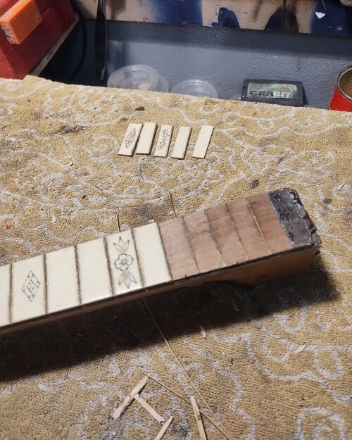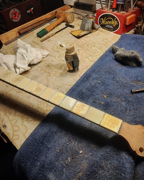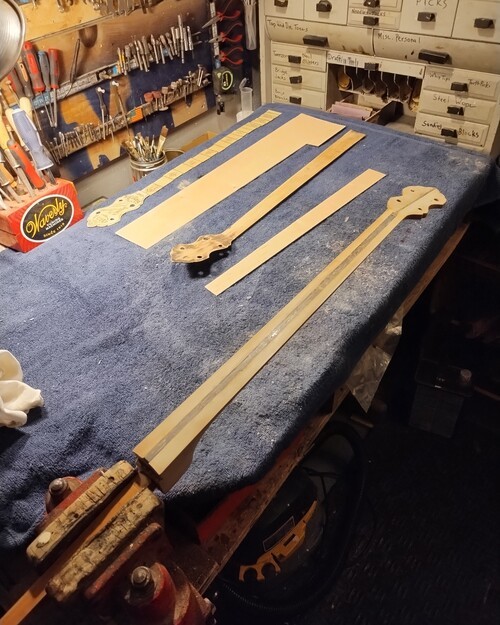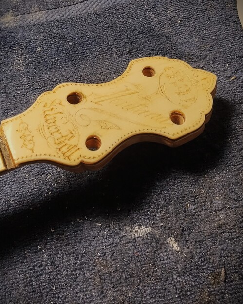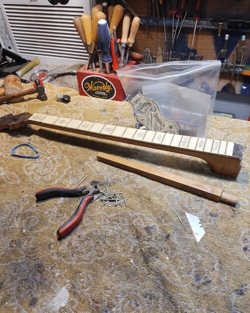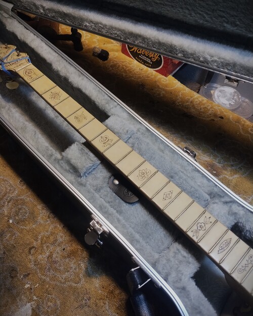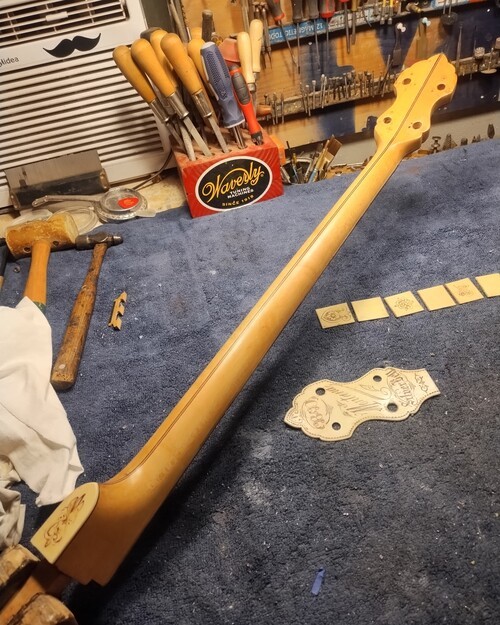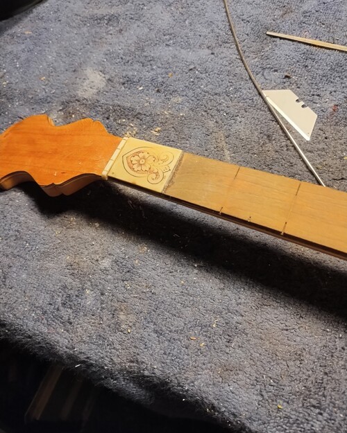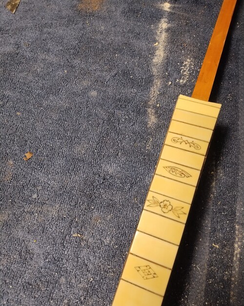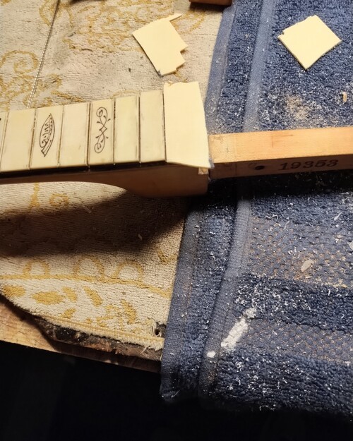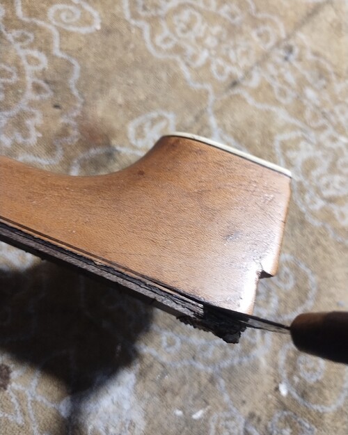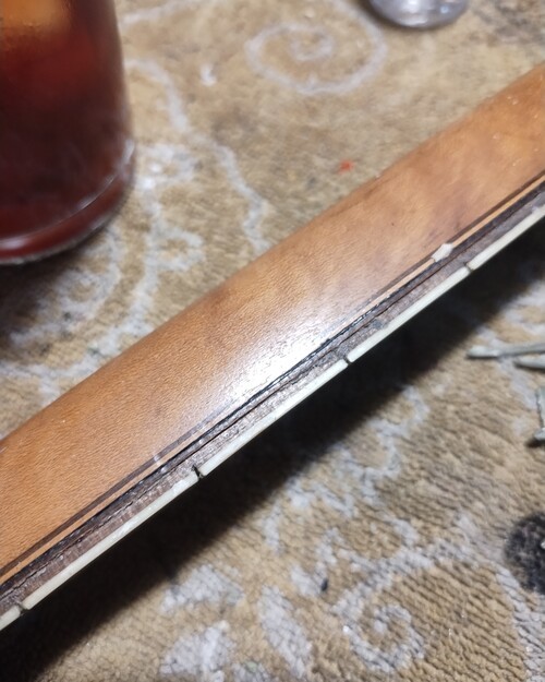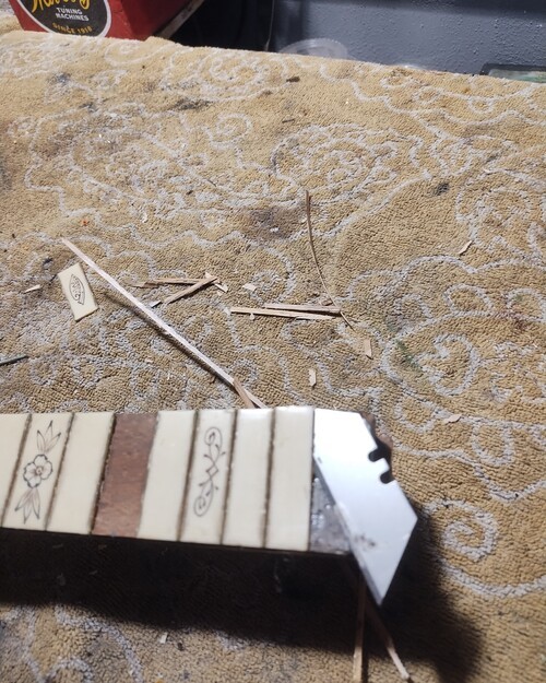 So the process will be to get the fingerboard celluloid removed and flattened, and the pearwood fingerboard under it removed with the maple laminate.