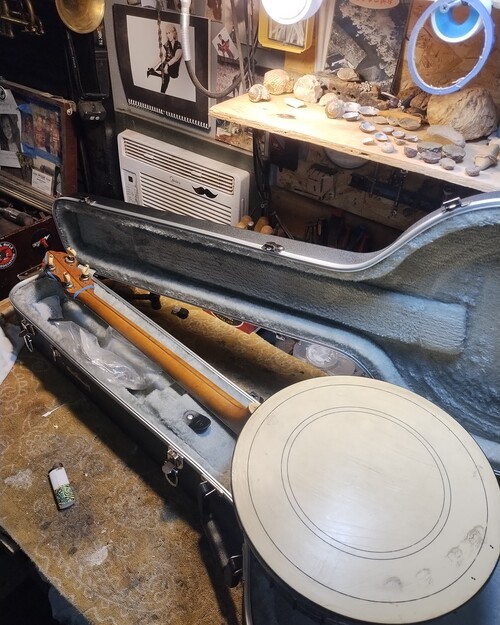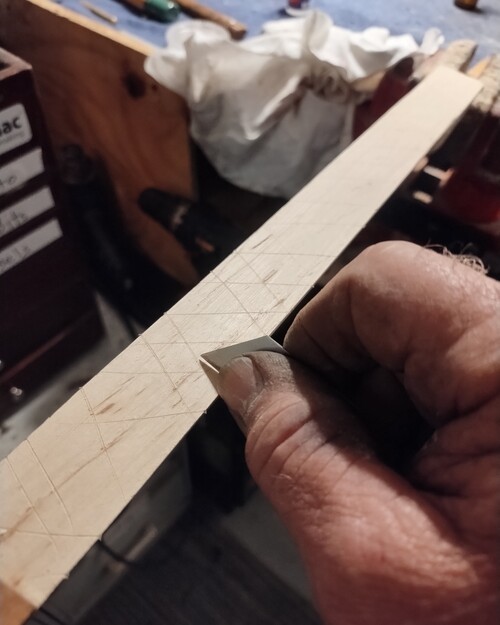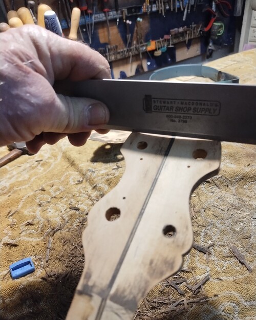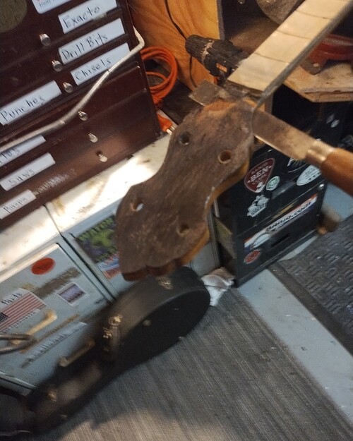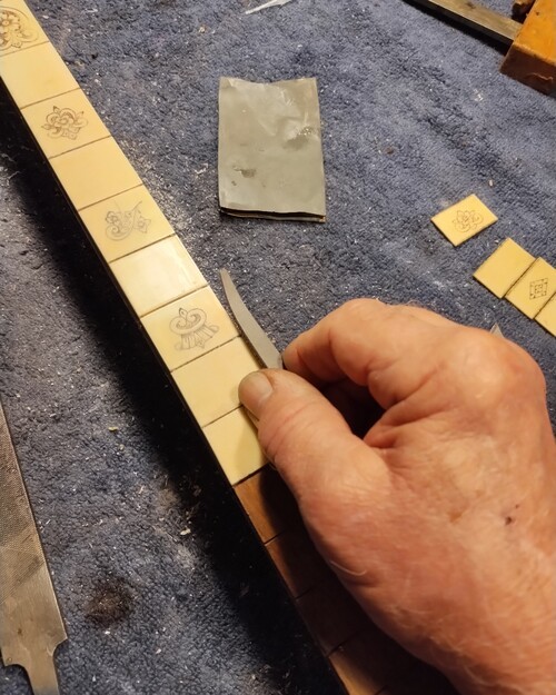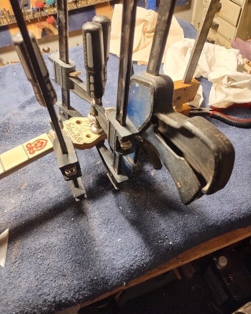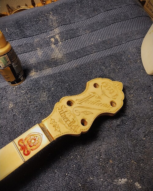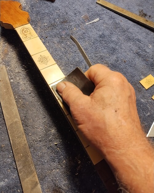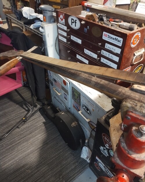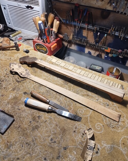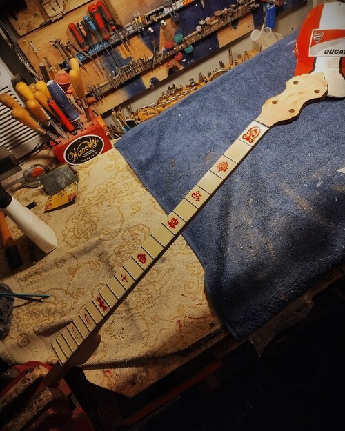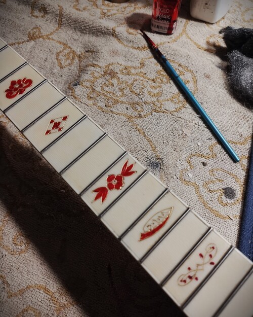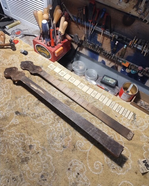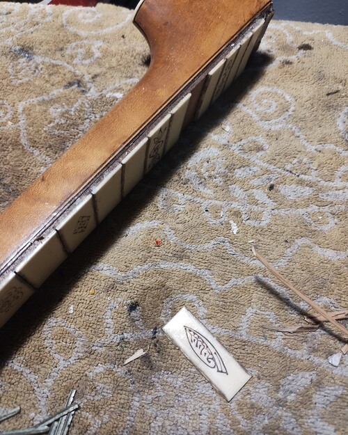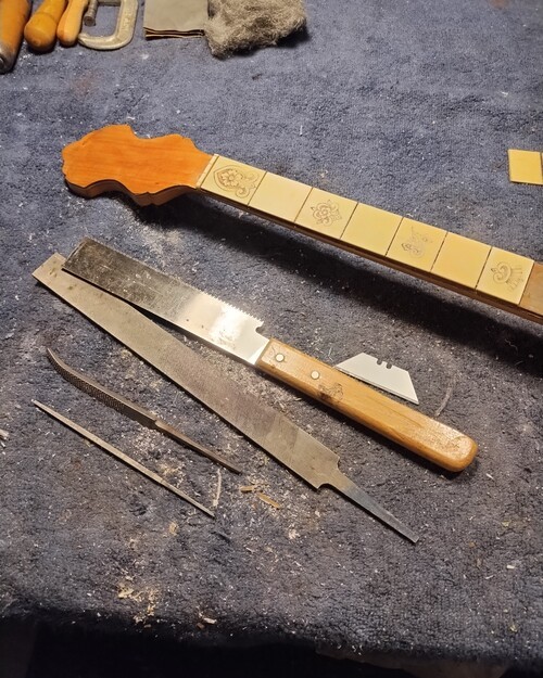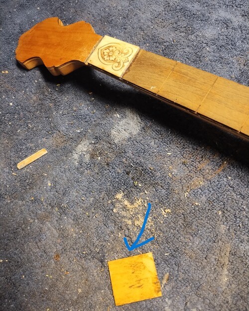 So the process will be to get the fingerboard celluloid removed and flattened, and the pearwood fingerboard under it removed with the maple laminate.