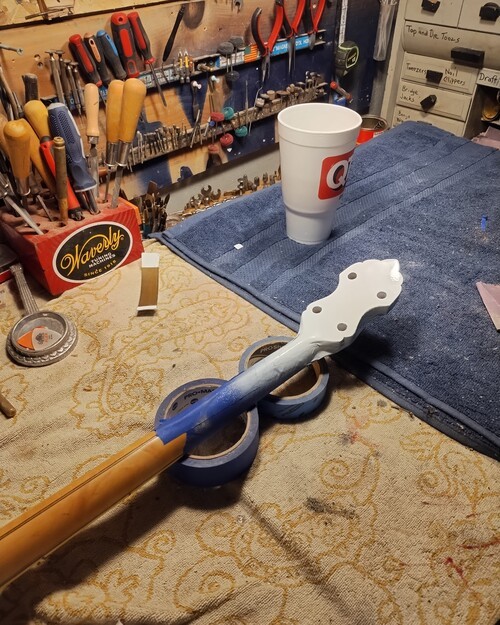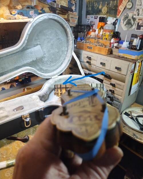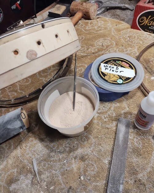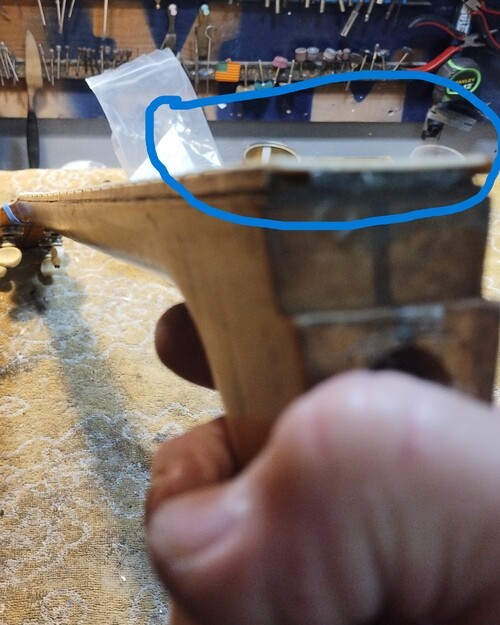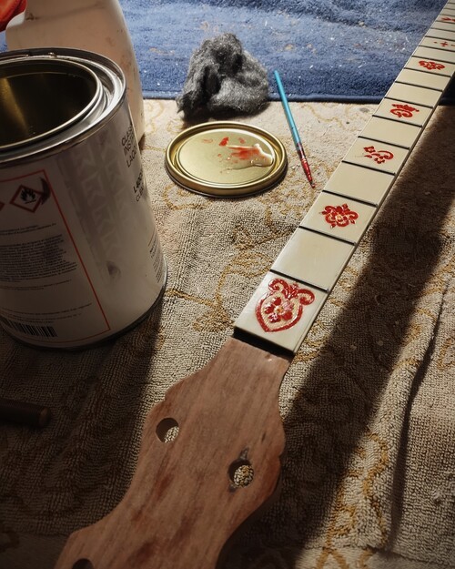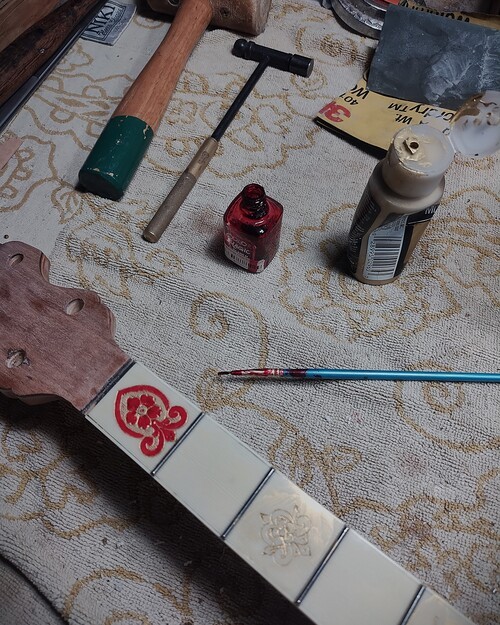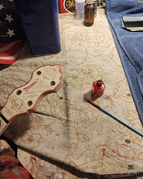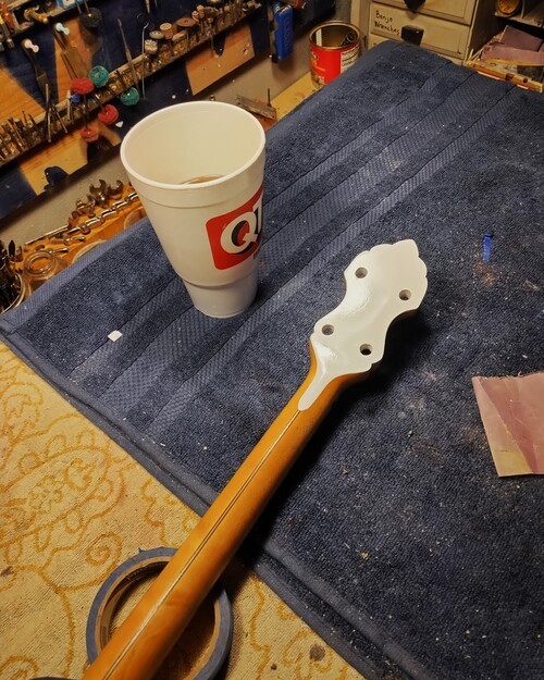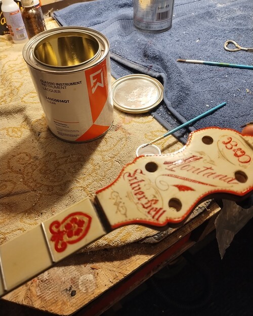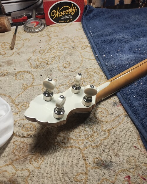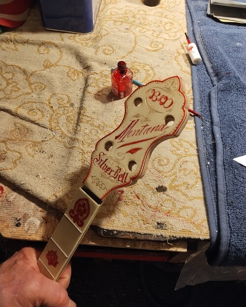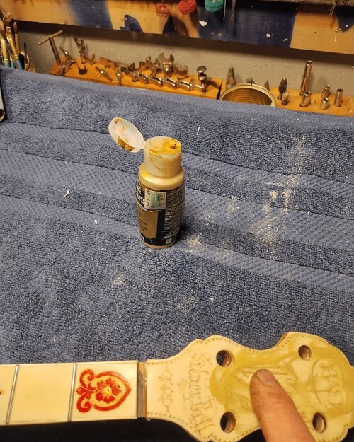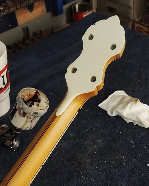The next pics show me hiding the numerous tuner peg screw holes that were drilled over time. There were 8 drill-outs for the 2:1 Grovers, not original. It will be fitted with a modern 4:1 geared tuners Since this version of Montana had no back strapping and rear peghead celluloid I merely mimicked that look with white lacquer.