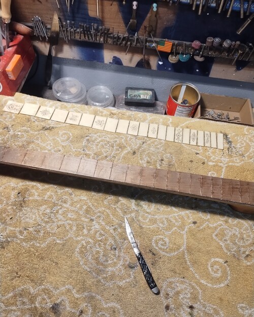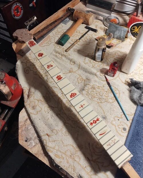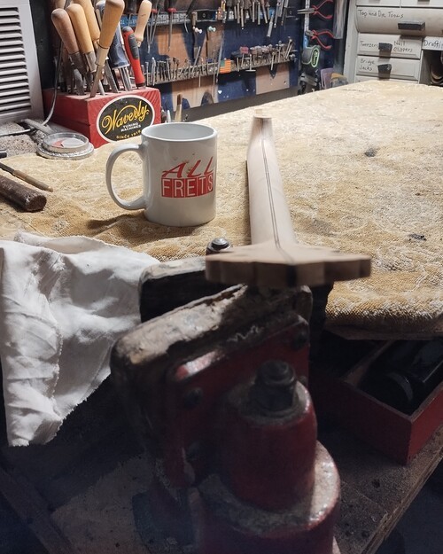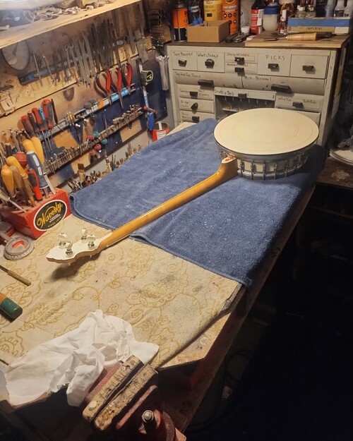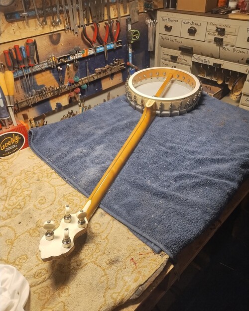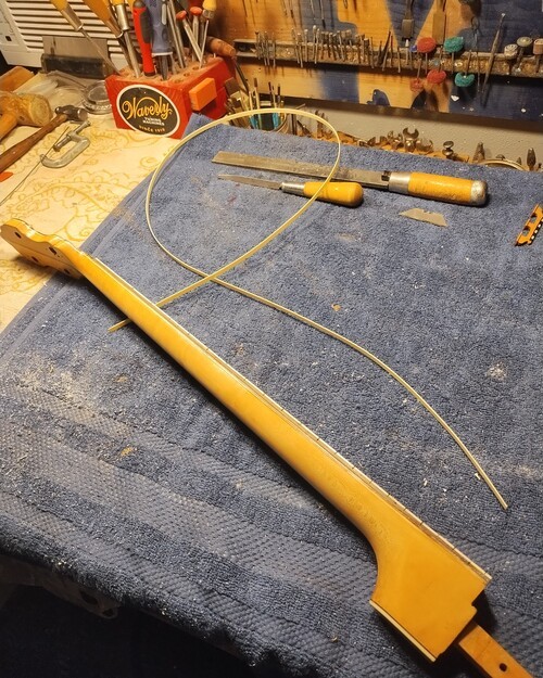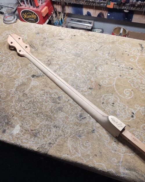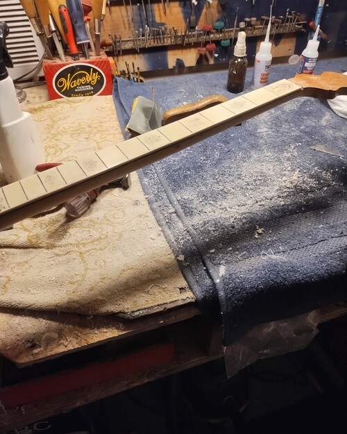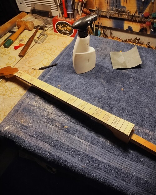Almost all settled in, I will check frets and head tension once more and then send it home.