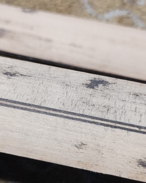 There is delamination of the fingerboard between the bottom pearwood laminate and the maple laminate. Pearwood was subjected to a corrosive chemical that blackened it in a factory process that was called "ebonizing".