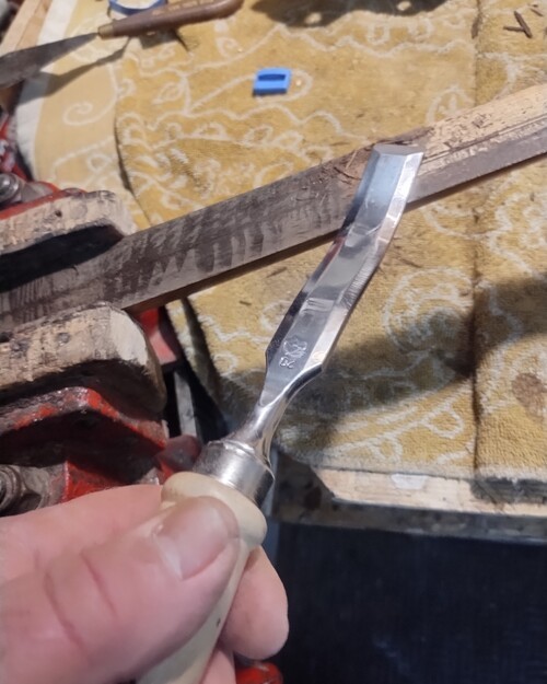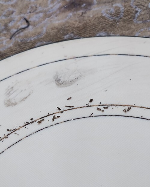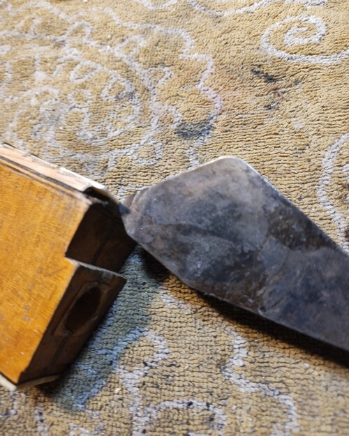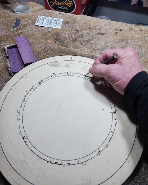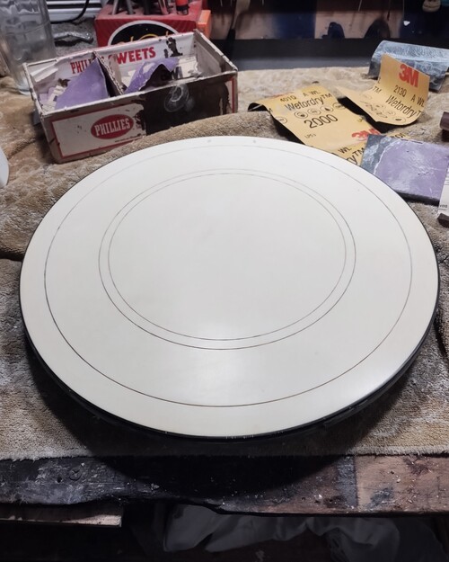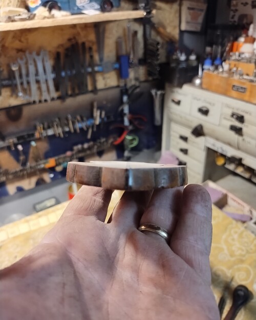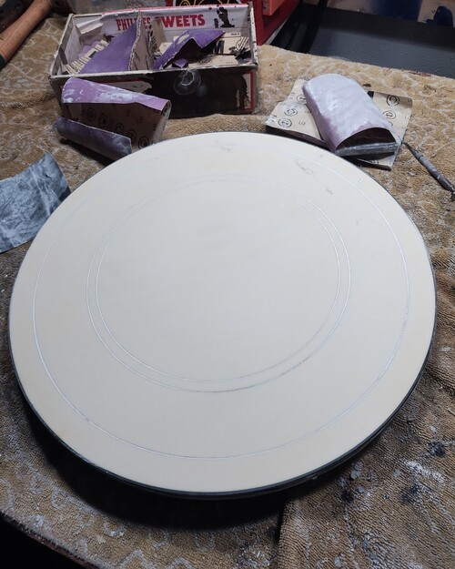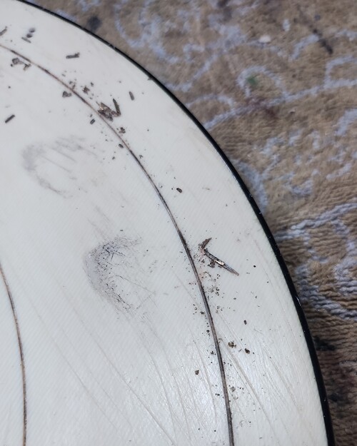 I cleaned the concentric lines of the grit, and of the old original gold leaf paint that only showed black from age, on the surface.