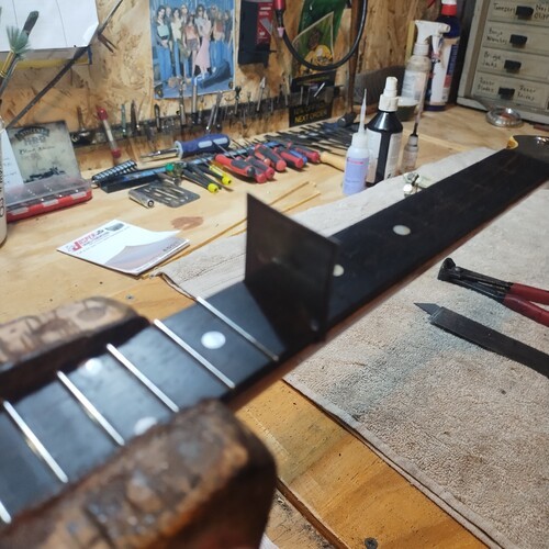 Frets all removed, tape protects from chip-outs.