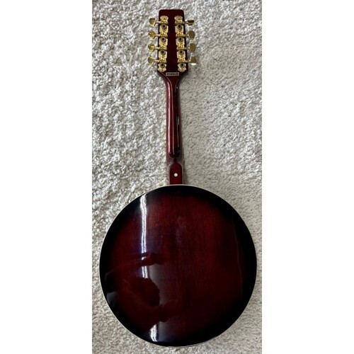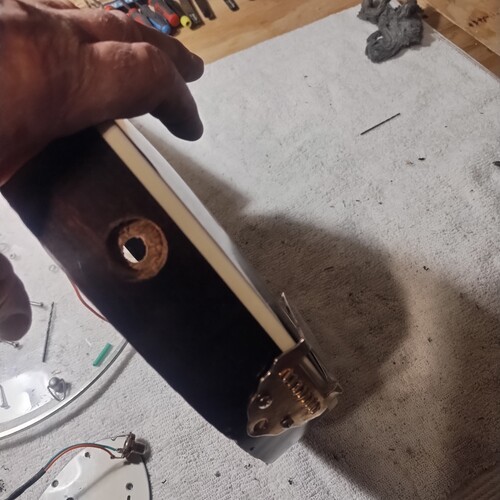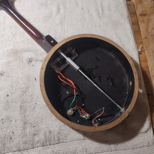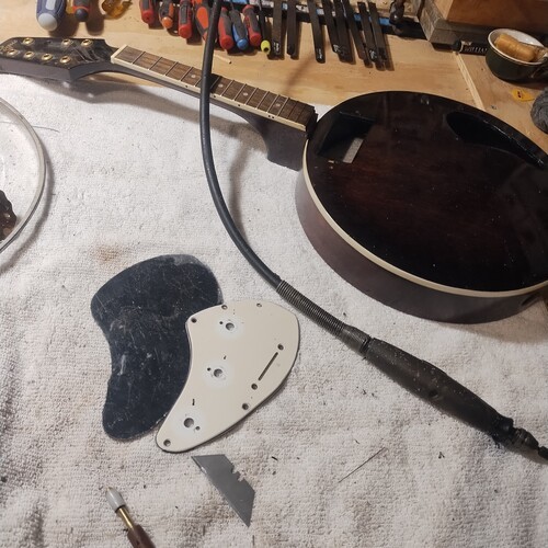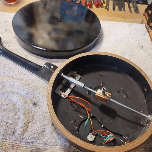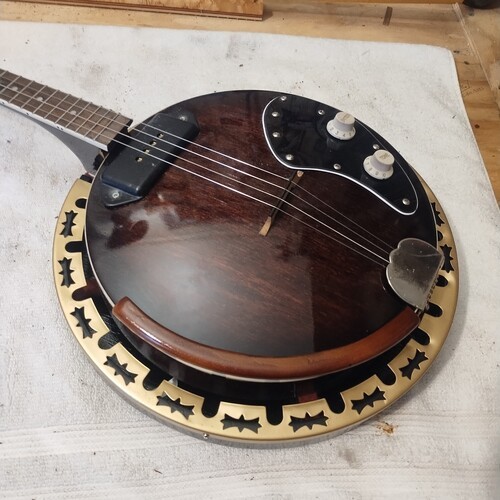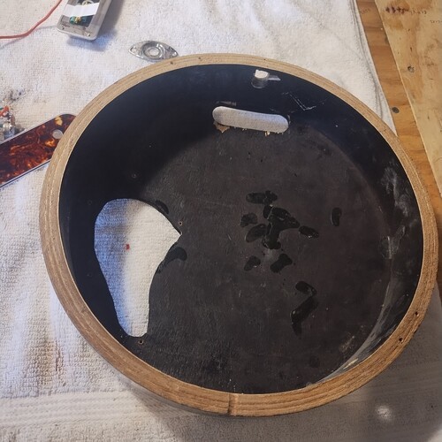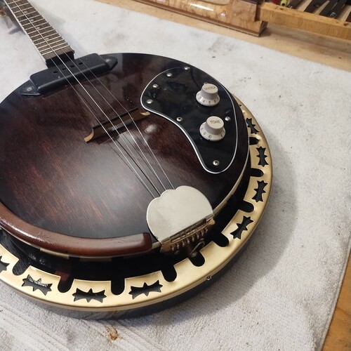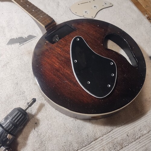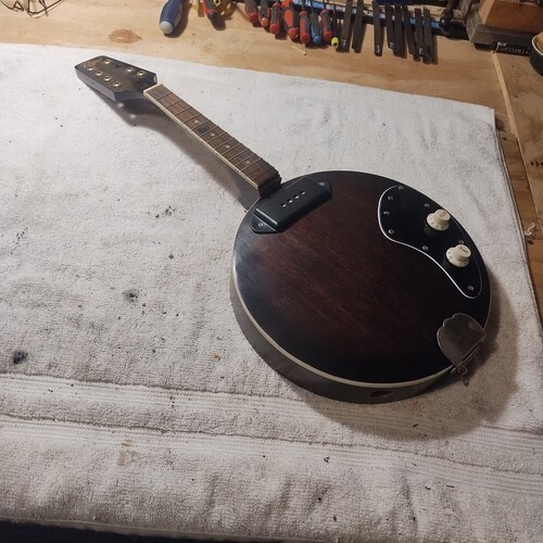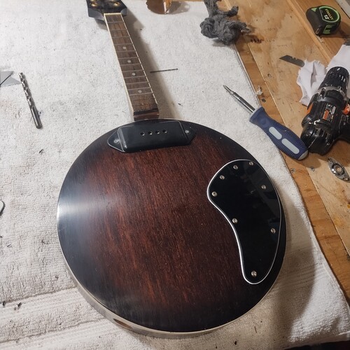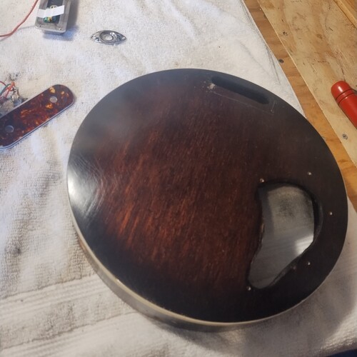 Someone had taken the resonator, turned it over and cut holes for a pickup and a pickguard and had began to attempt to fabricate a " wooden archtop electric banjo mandolin" (whew)