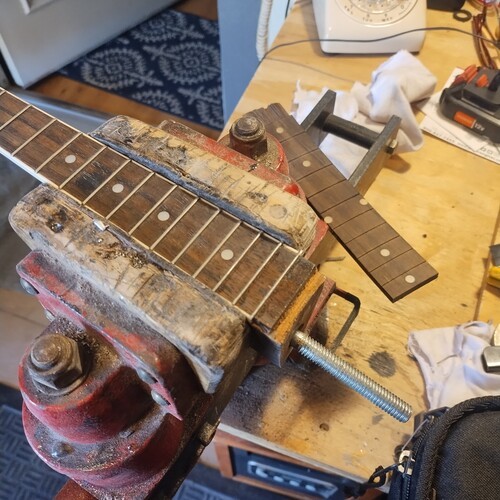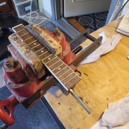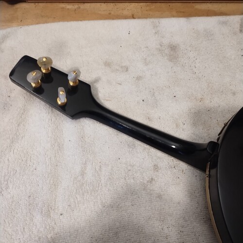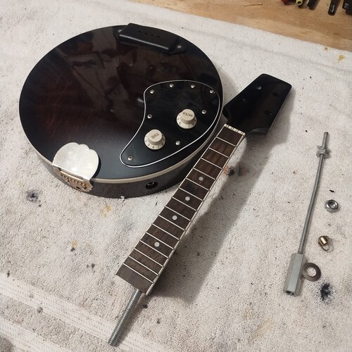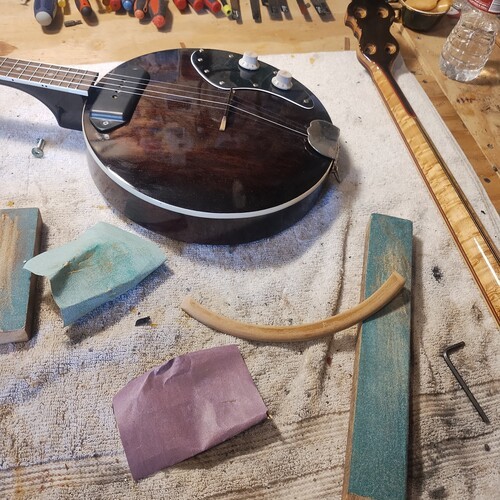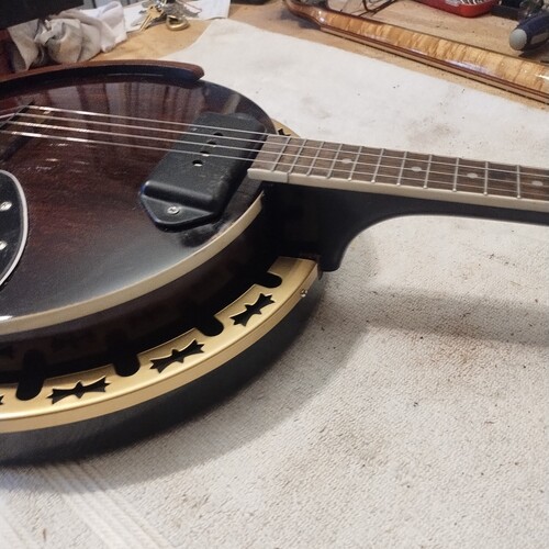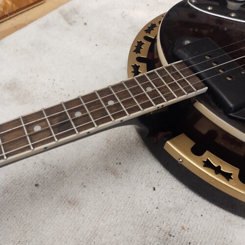 This project came to me as a Neck and Resonator from an import "Rogue" banjo mandolin, with a broken off fingerboard (at the runoff)