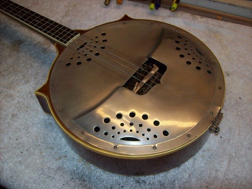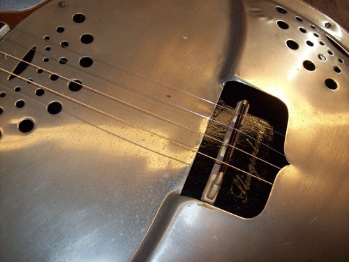 Strings touch cover plate for resonance and it sounds like a resonator guitar.