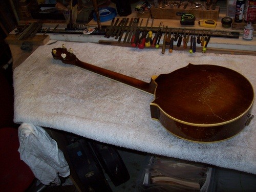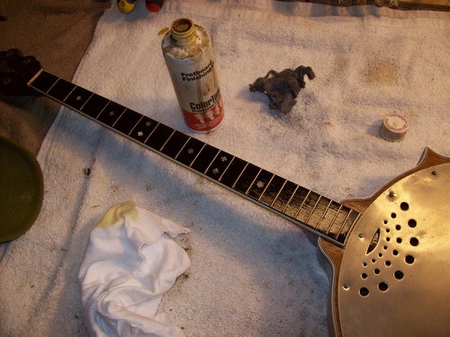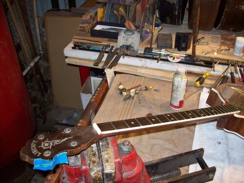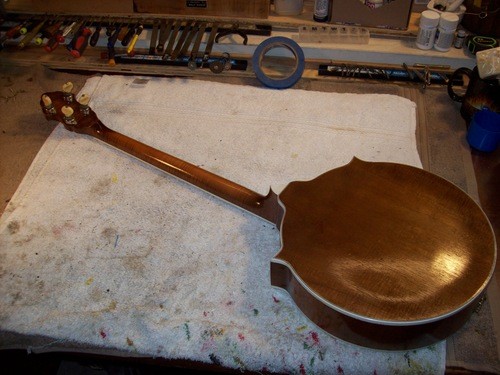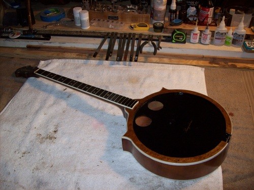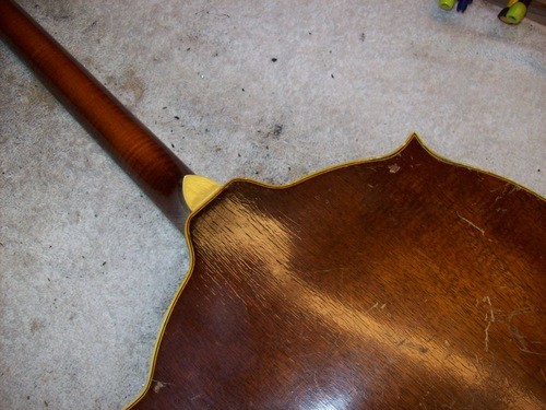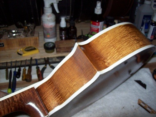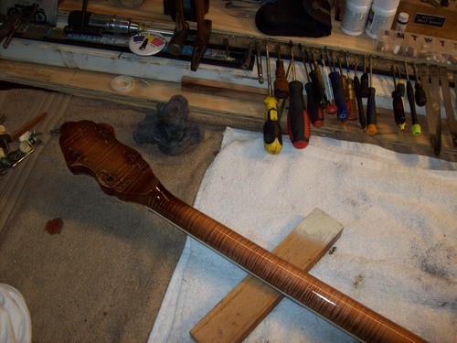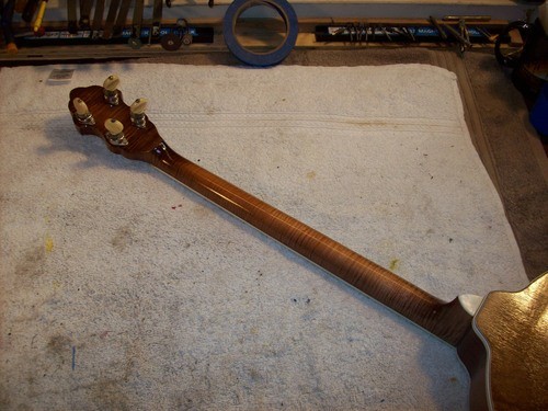 Peghead, neck and body stripped, and 3 fresh coats of nitro lacquer applied.