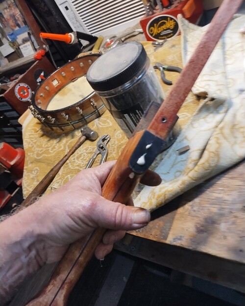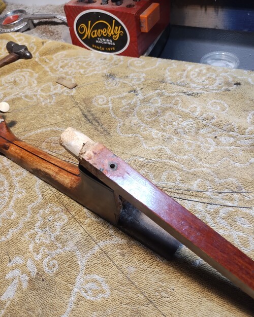 Fingerboard on head, dowel has let go.