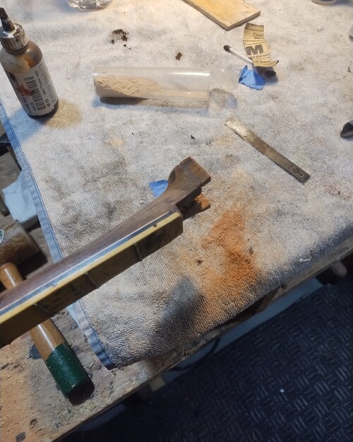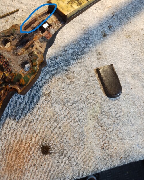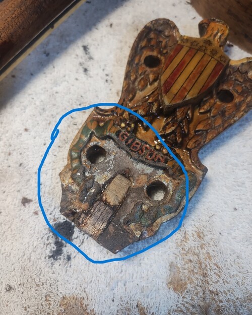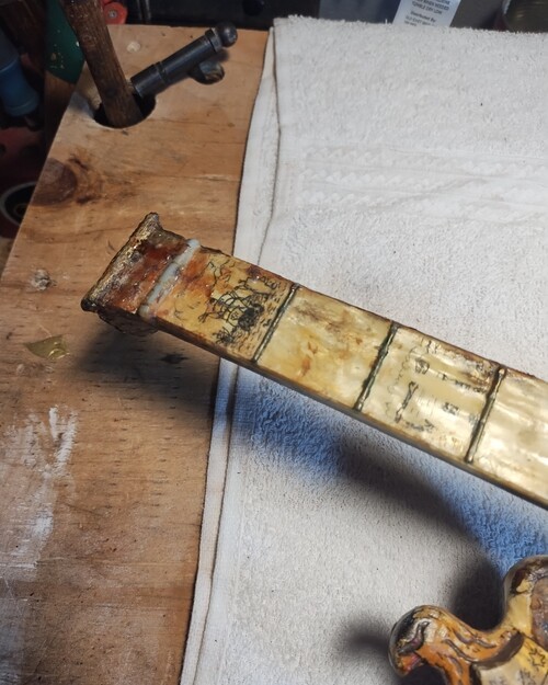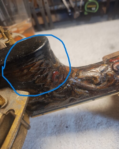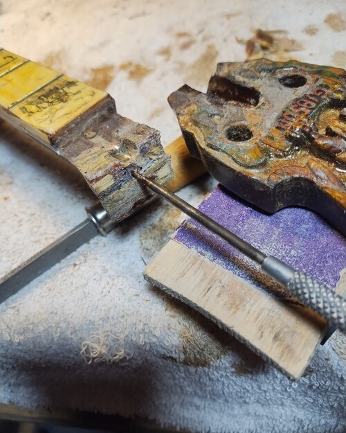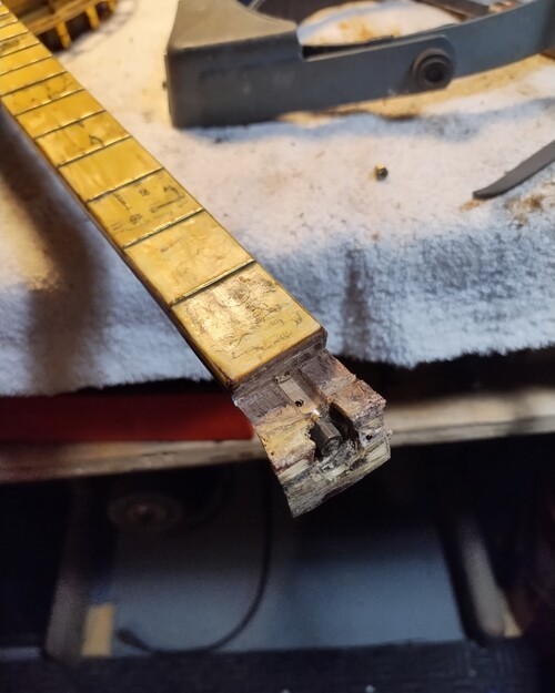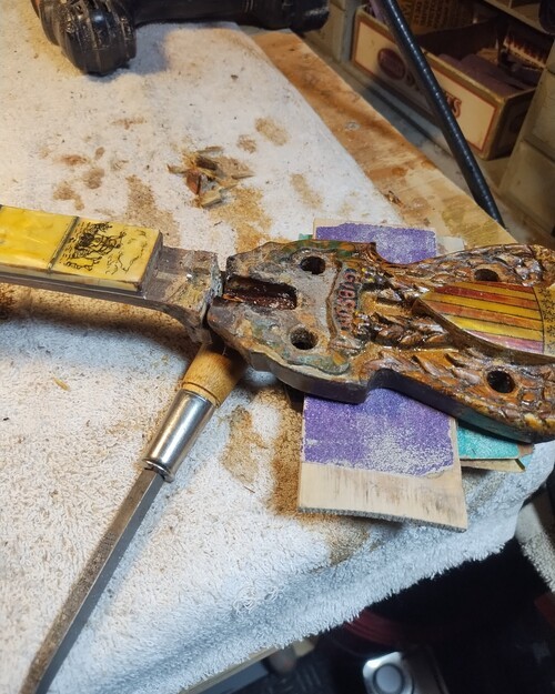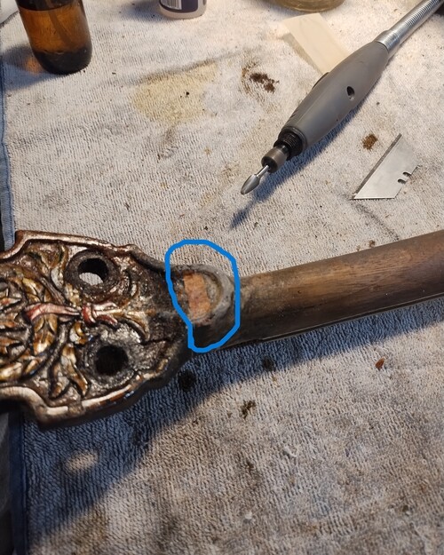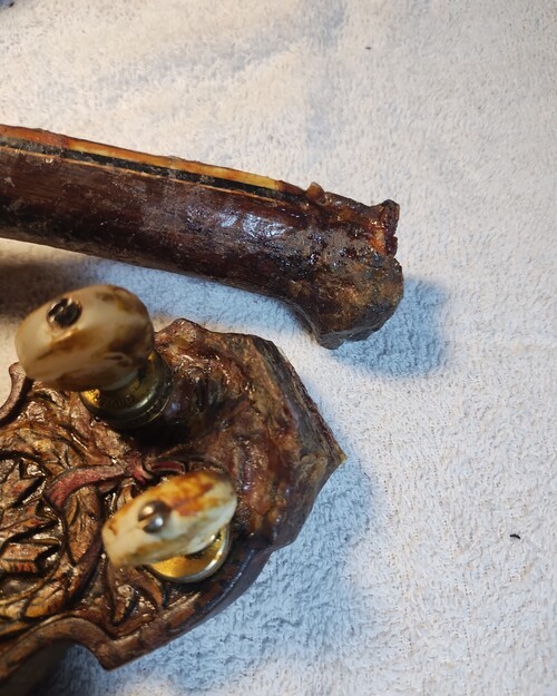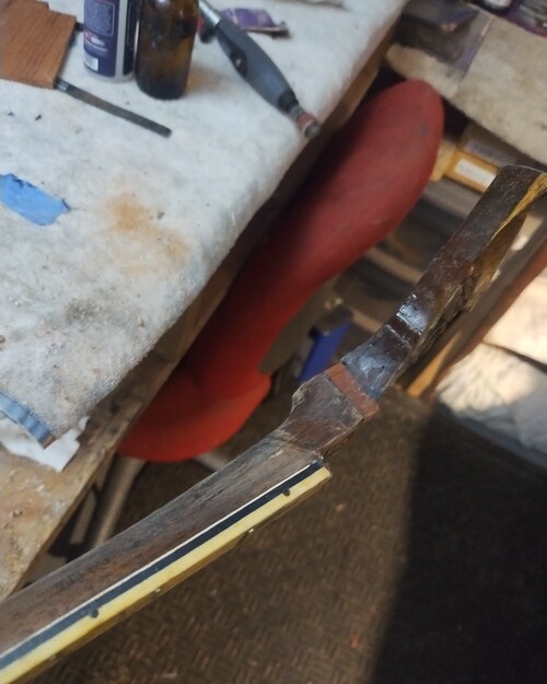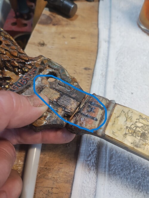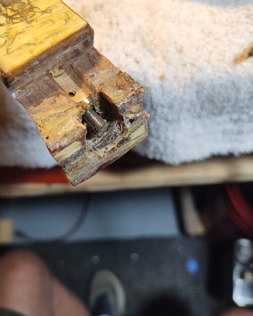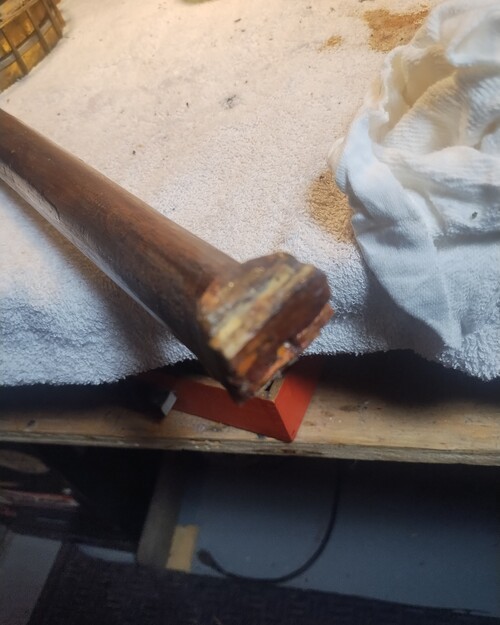 The bottom wood is the attempted repair, that was over the pin they tried.