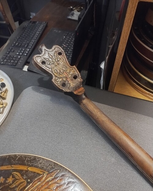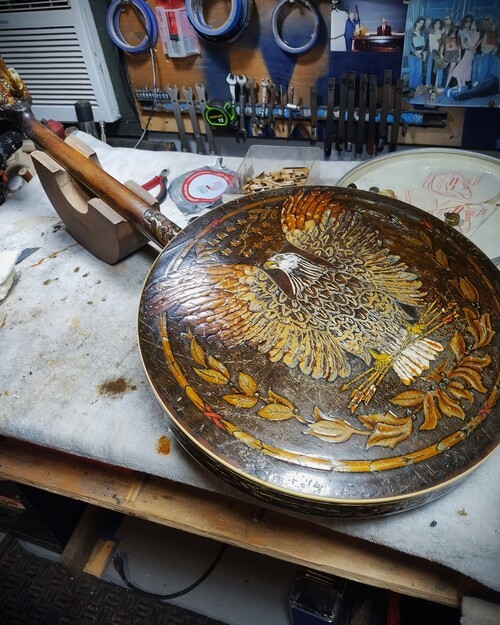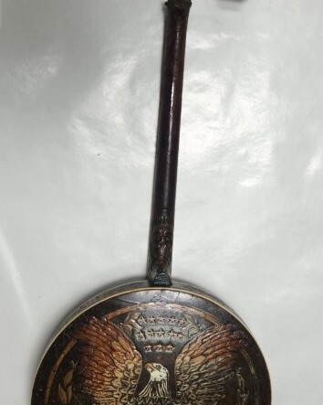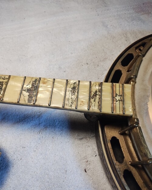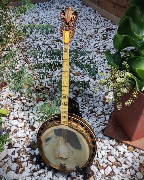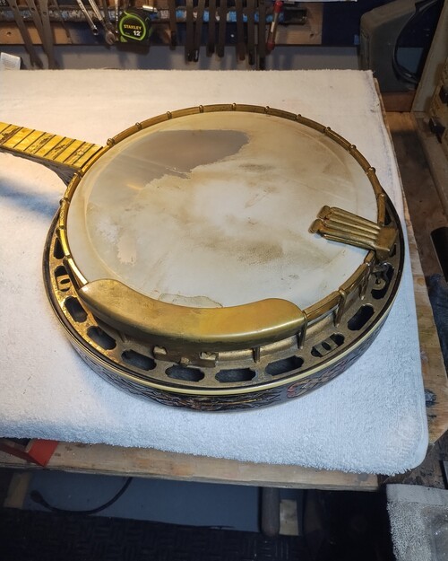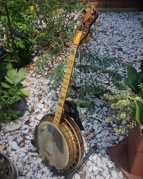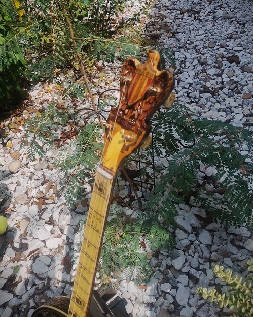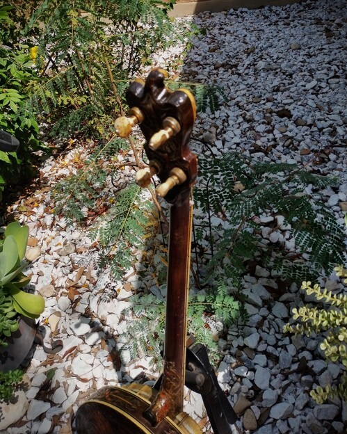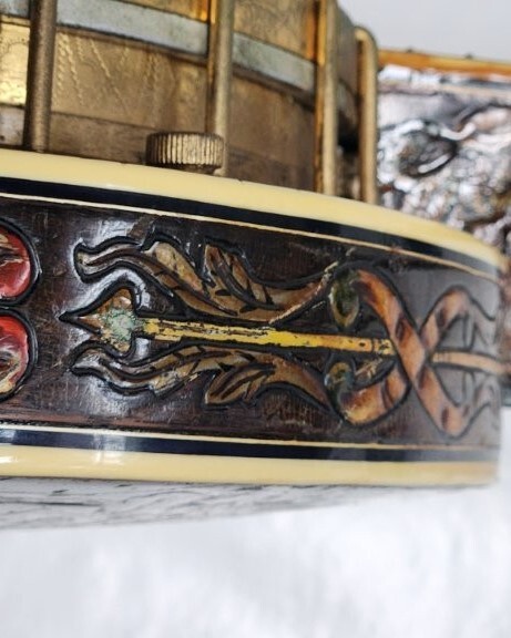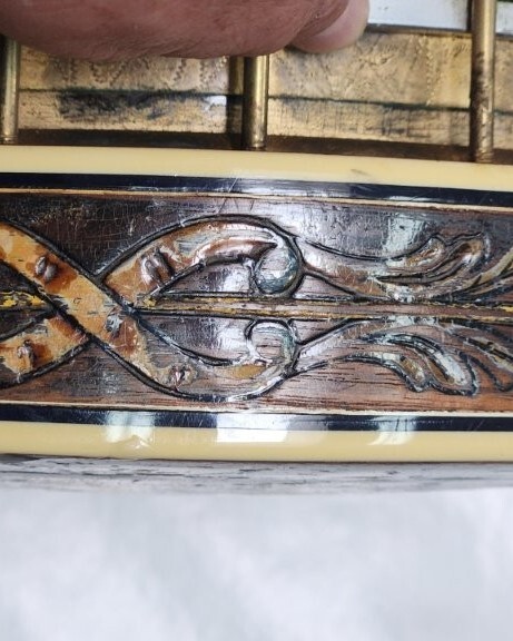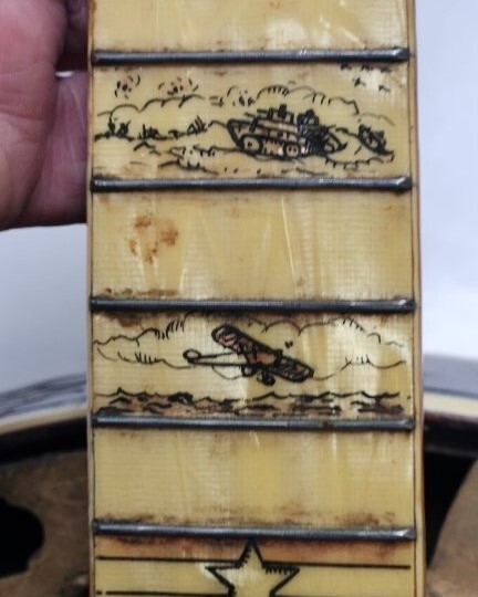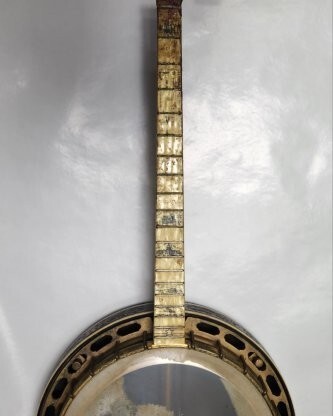 This banjo was left in the state that it was in when last played, other than the necessary repairs. It is this way to represent what 1930's Musician on the Western Swing circuit would play and the condition it would be in from many years of constant and hard use with only it's demise stopping it.
