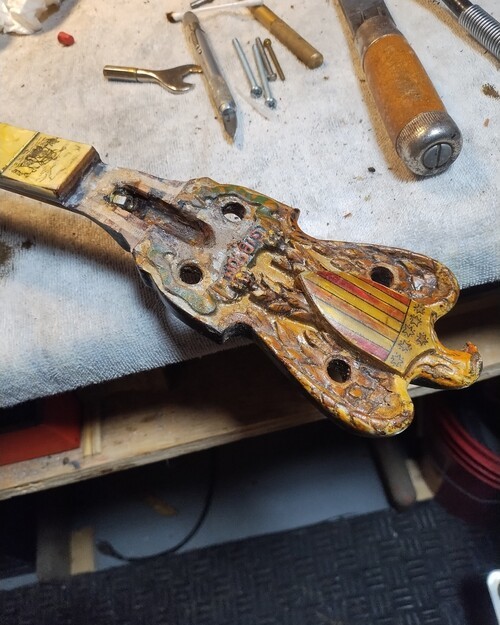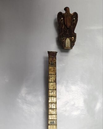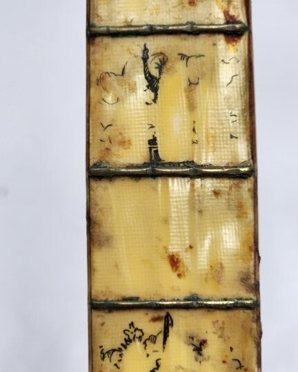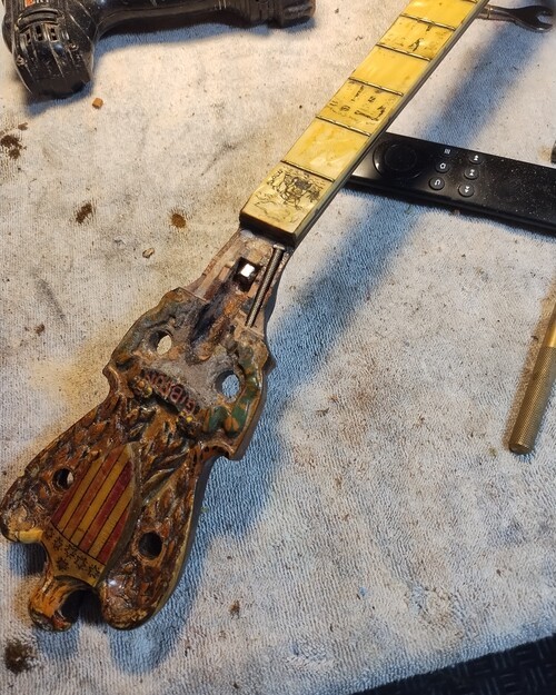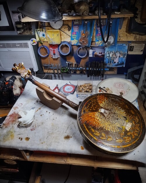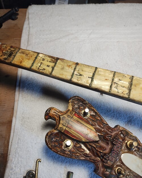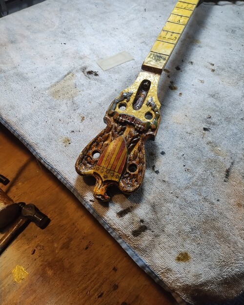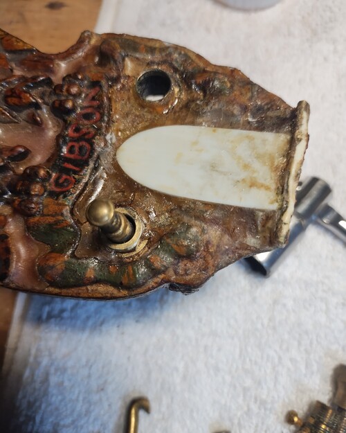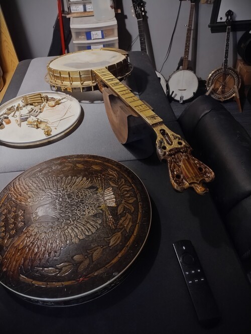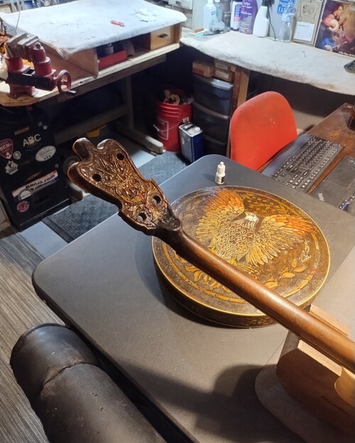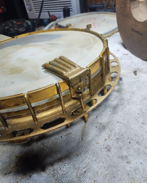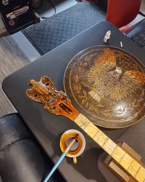 This banjo was left in the state that it was in when last played, other than the necessary repairs. It is this way to represent what 1930's Musician on the Western Swing circuit would play and the condition it would be in from many years of constant and hard use with only it's demise stopping it.