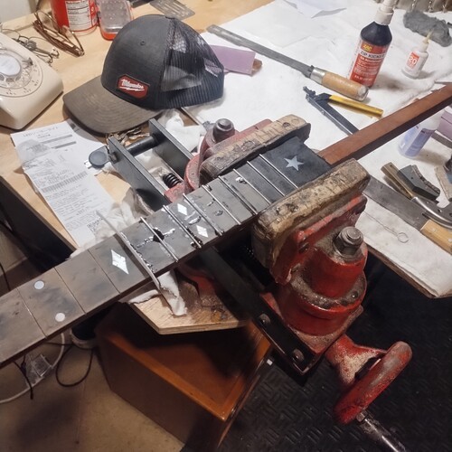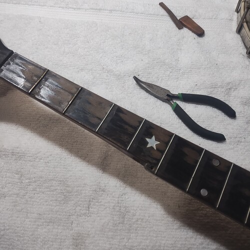 Moving along slowly, sealing frets as I go.