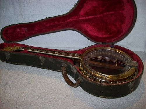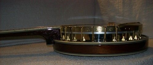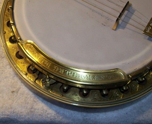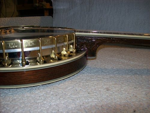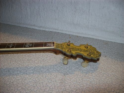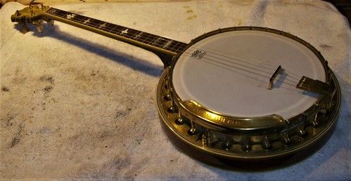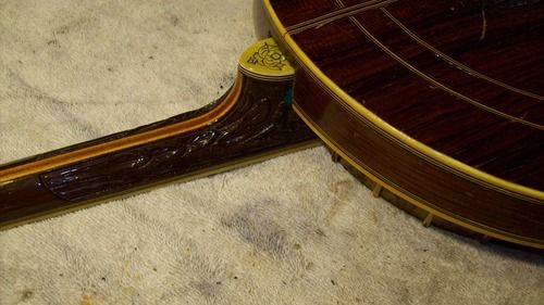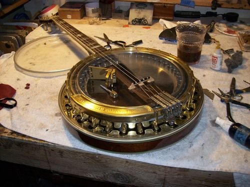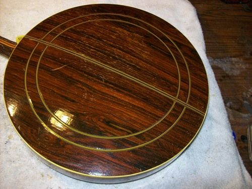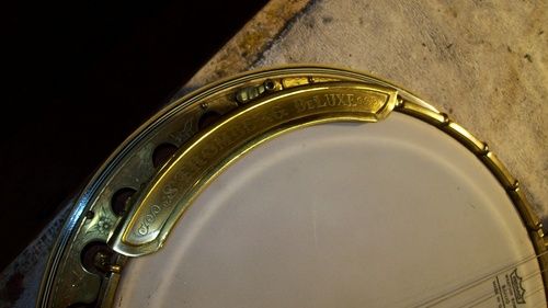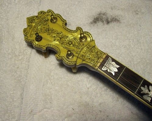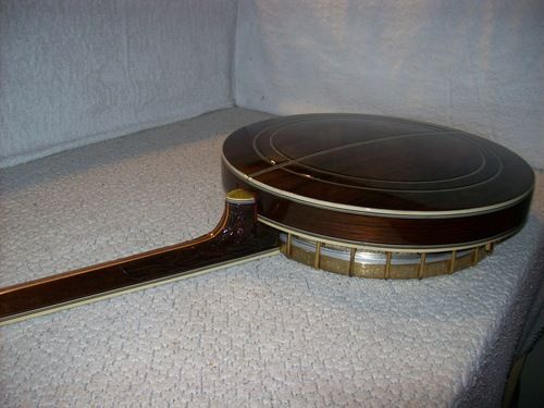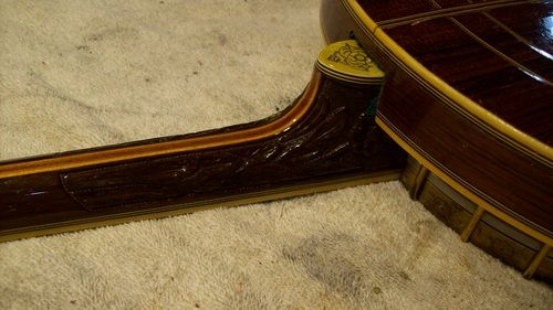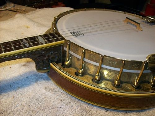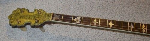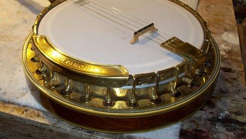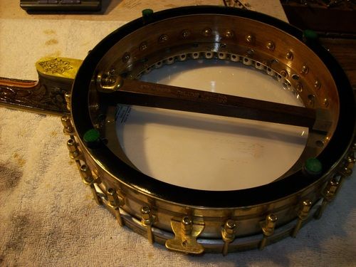 The banjo had an aftermarket mute in its life, I have seen the style, but the only vestige of it is the string post on the front of the rim and the hole in the dowel where it attached, nothing else.