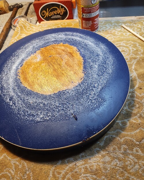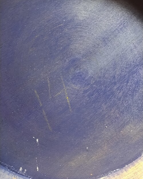It has a repair on the sidewall from the lathe catching it and maybe t he reason it changed to blue.