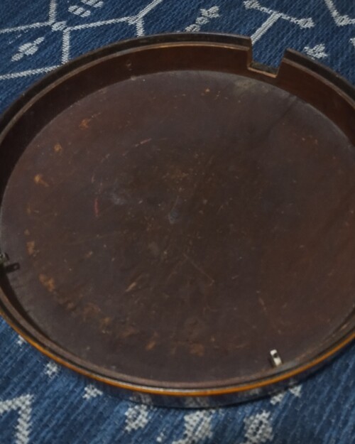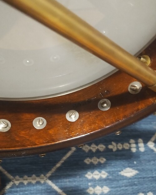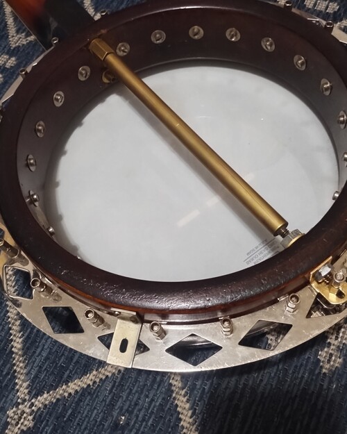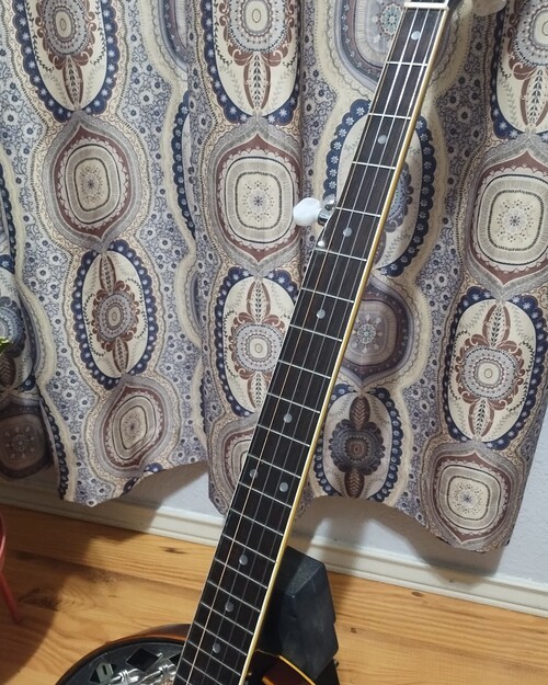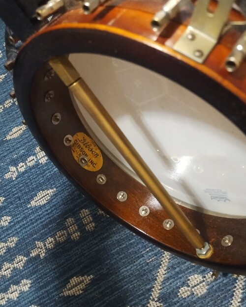 This rim assembly came to me without a neck from an estate sale. I used a neck I had here also from an and added finish to it. The resonator had a small hole that I repaired and finished on the outside only. Added some pegs and a long Kirshner style tailpiece. adjustable truss. It is a one piece flange neck, I did not alter the heel cut so that if I wanted to use it on something else later I could if no one has an interest in this configuration. It is meant to be a player, not a collectible and I put it together from parts and pieces. Locals only, and you can try before you buy. Will answer any serious questions. Prewar Gibson people, it is what it is. TB-0 Diamond plate flange FON# 8439- XX 11"x 5/8" rim 22 bracket Diamond flange 1/2" tube tone ring Orig. 2 piece armrest made for the 22 bracket Mahogany neck, dot inlay, side markers. Shell veneer on peghead Geared pegs Missing one resonator lug, the 1/4" style. others have non original thumbscrews. Rim has label but someone has sprayed some finish, not over the label. Heavy brass co-rod, makes up for the weight of having two, and single rod was common then. And I happened to have this nice machined one.