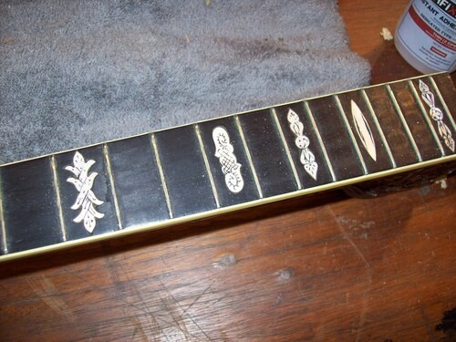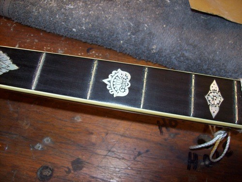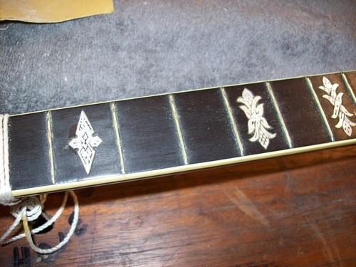 I re-cut the fret slots to modern fret wire dimensions and then I removed the tang barbs from the new wire so as to give the least amount of resistance, so as not to force in back into the condition it was in.