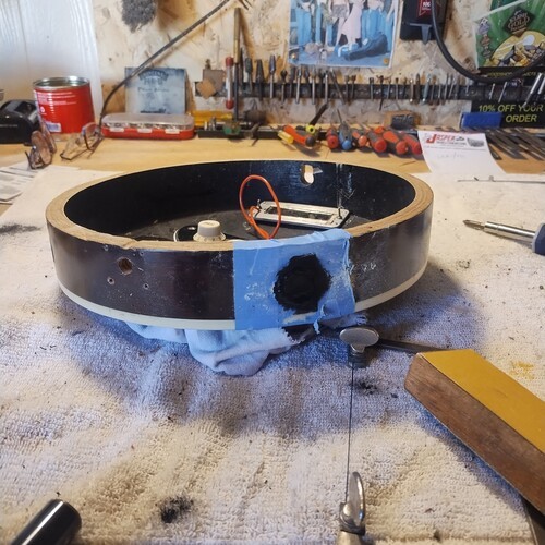 Someone had taken the resonator, turned it over and cut holes for a pickup and a pickguard and had began to attempt to fabricate a " wooden archtop electric banjo mandolin" (whew)