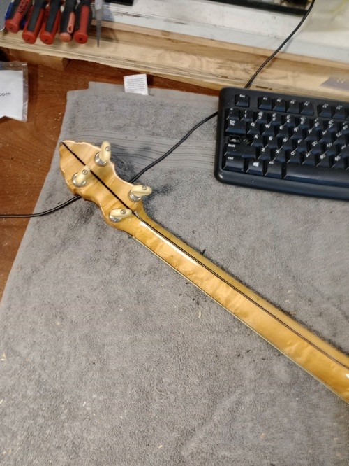 I will utilize the old dowel, peghead overlay and heel cap to make the new neck compatible with the rim