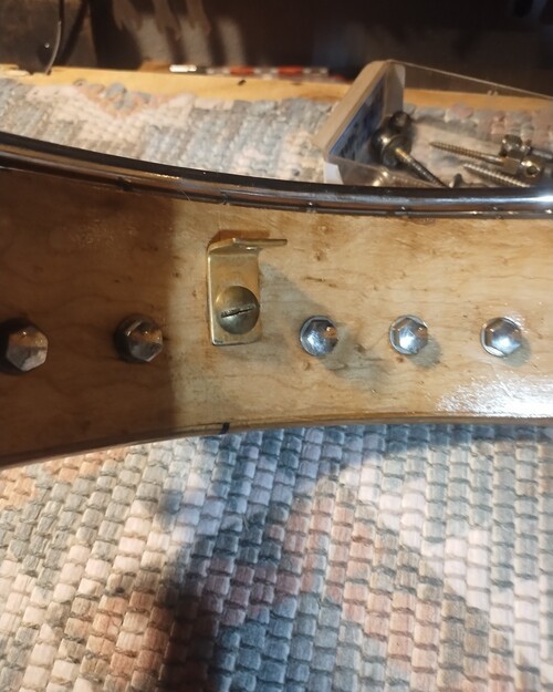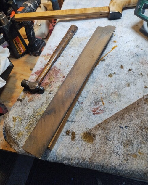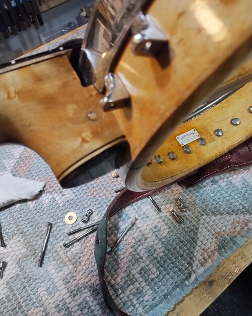 Fill small screw holes, prep for modern pegs.