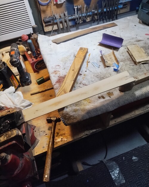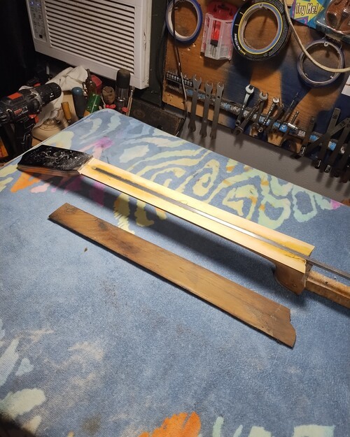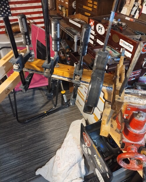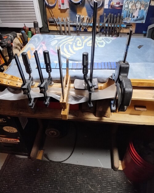 F board pinned and glued, in clamps, 8 hrs.